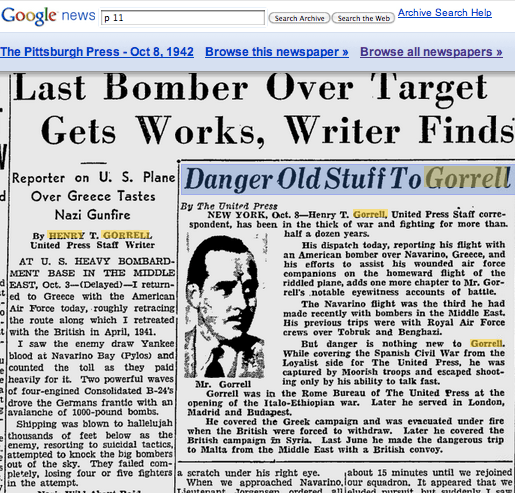 Google’s news archive has a copy of Gorrell’s dispatch from the bombing run; click the image to see the full clip and compare his first-person story with the radio narration.