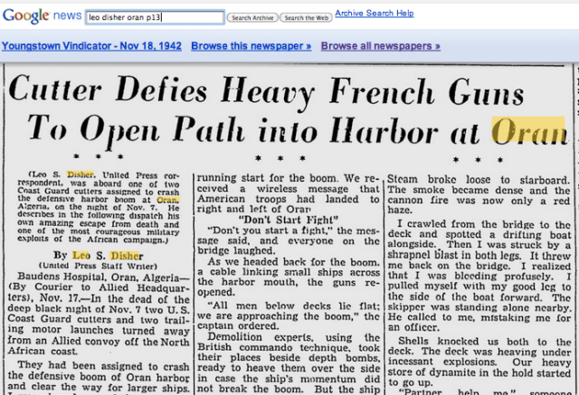 Disher was aboard one of two U.S. Coast Guard cutters that came under heavy fire while crashing a harbor boom to open Algeria’s Oran harbor. His survival account became the fifth episode of United Press’s “Soldiers of the Press” radio series.