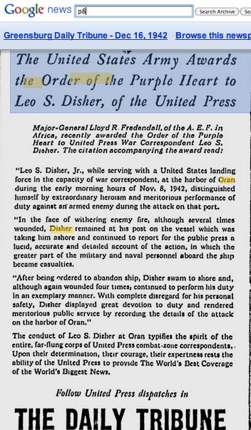 United Press correspondent Leo S. Disher Jr. became the first combat reporter awarded the Purple Heart — citing “extraordinary heroism and meritorious performance of duty” for action on a day in November 1942 that started with his ankle already in a plaster cast.