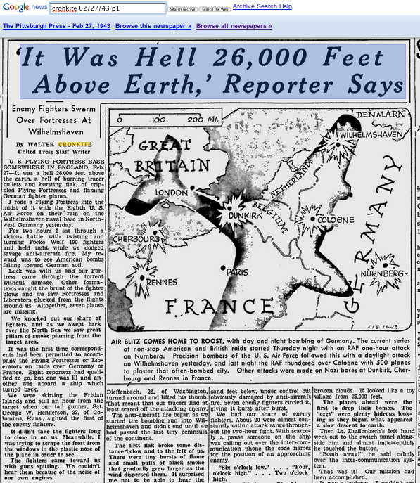 Last year’s D-Day item also didn’t include a player for one of Cronkite’s stories as dramatized by “Soldiers of the Press,” so here is a sample. His own D-Day activities aren’t available in the audio archive, so this story is from 1943, when Cronkite was covering the air war over Europe.