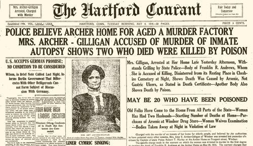 In any case, there was nothing humorous about the original story — as is clear from its Courant “Murder Factory” May 9, 1916, front page headline.