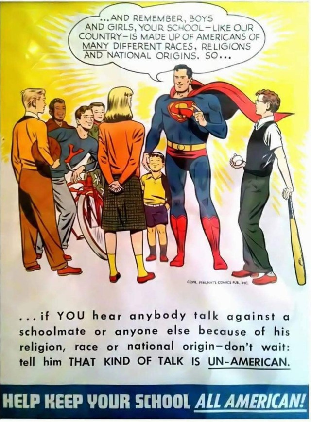 The theme of Superman fighting intolerance and hatred continued in other media, including a poster that resurfaces frequently on the World Wide Web, Facebook and even sites that sell reprint posters.