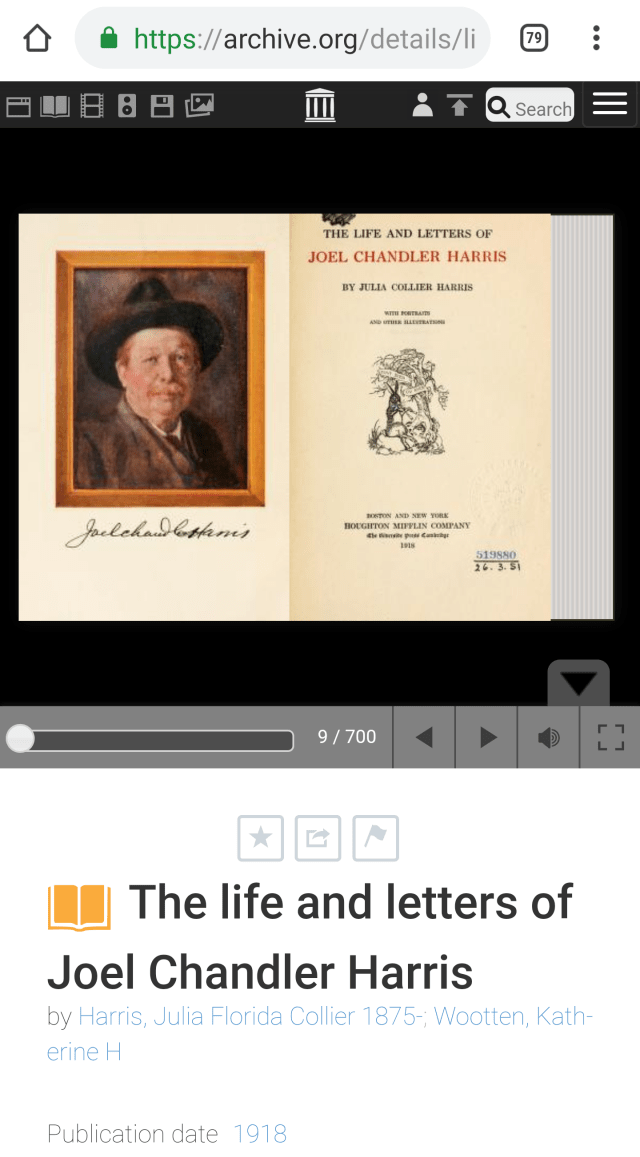 In addition to providing an oldtime radio dramatization of the life of newspaperman turned reteller of folktales Joel Chandler Harris, the Internet Archive has his works and biography, including the volume shown above.