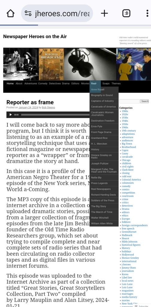 About this site: There are 10 major topics to this discussion of the portrayal of newspaper journalists in old time radio shows; There are 75 subtopics, and hundreds of blog posts about individual episodes, programs or plots. When I was teaching a course on the “Portrayal of Journalists in Popular Culture” those posts were more frequent. Now that I’m retired, I still add an “episode” blog post now and then, months may pass between them. For that reason, Scrolling down to the most recent individual blog posts may not be the most interesting way to explore the site. Using the “search” field, categories, or topic menus may be more satisfying.